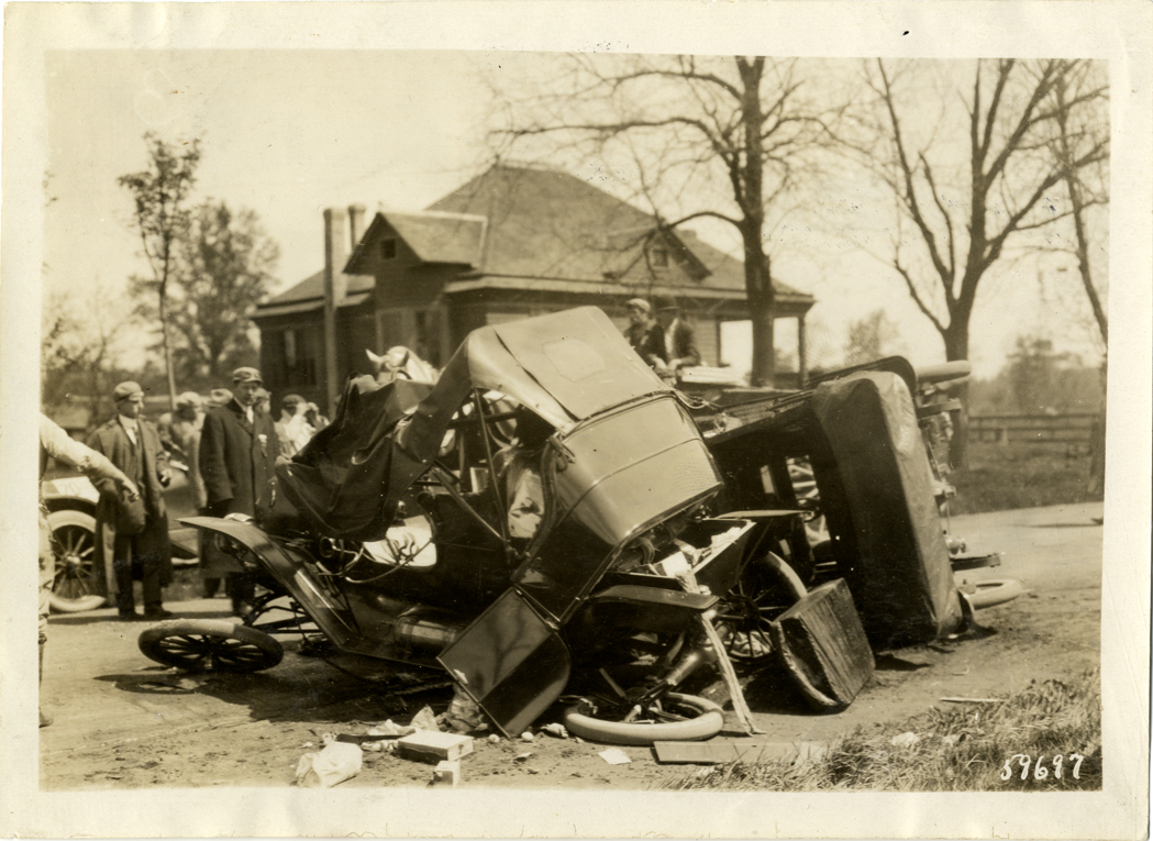 View of damaged Ford car and an unidentified car in aftermath of accident; onlookers in background. Stamped on back: "Spooner & Wells, Inc., photographers, telephones 3472-3473 Columbus, 1931 Broadway, New York." Handwritten on back: "Car in foreground is a Ford. Accidents."