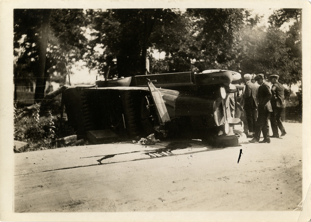 View of men looking at an overturned car on roadside in the aftermath of an accident. Stamped on back: "Photo by N. Lazarnick" and "Photo by N. Lazarnick, automobile photographer, 246 W. 42nd St., N.Y." Handwritten on back: "Accidents."