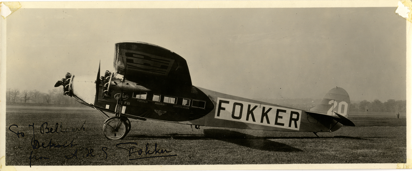 View of a Fokker F.VII plane. "Fokker F VII" and "Fokker Aircraft Corporation" is painted on side of plane. Handwritten on front: "To J. Bellart at Detroit from A.H.G. Fokker."