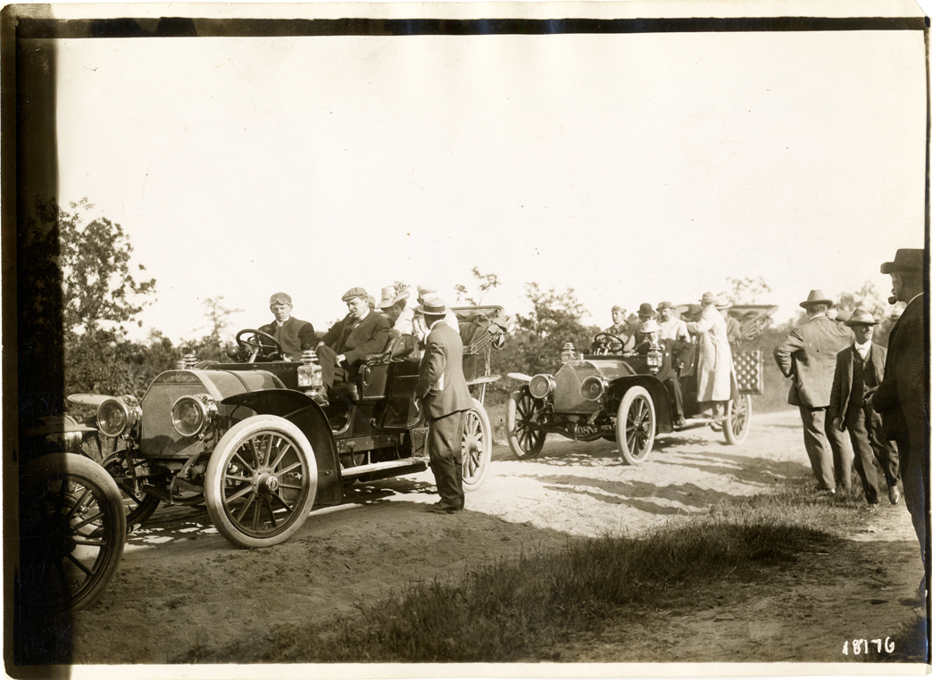 View of motorists in two Alco cars. Stamped on back: "Photo by N. Lazarnick, 29 West 42nd Street, N.Y., tel. 594 Bryant." Handwritten on back: "1907/8 Alco made by American Locomotive Company. Second car also Alco."