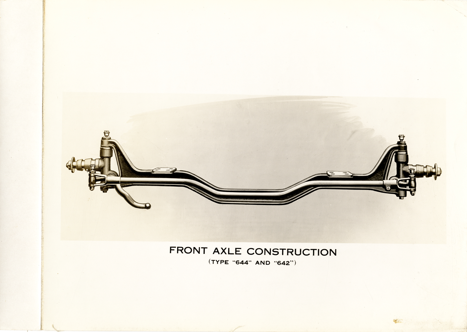 Artist's depiction of the front axle construction for a 1914 American car. Printed on front: "Front axle construction (type '644' and '642')." Handwritten on back: "American, 1914."