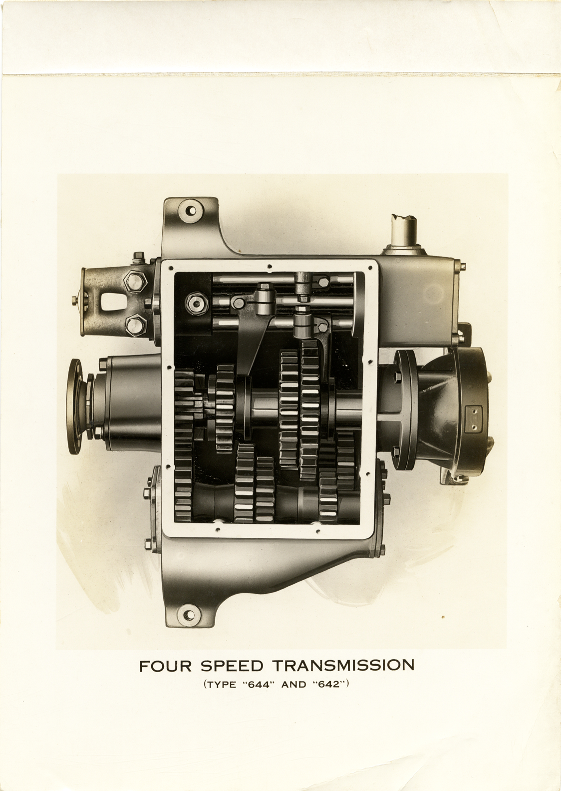 Artist's depiction of a four speed transmission for a 1914 American car. Printed on front: "Brake construction (type '644' and '642')." Handwritten on back: "American, 1914."