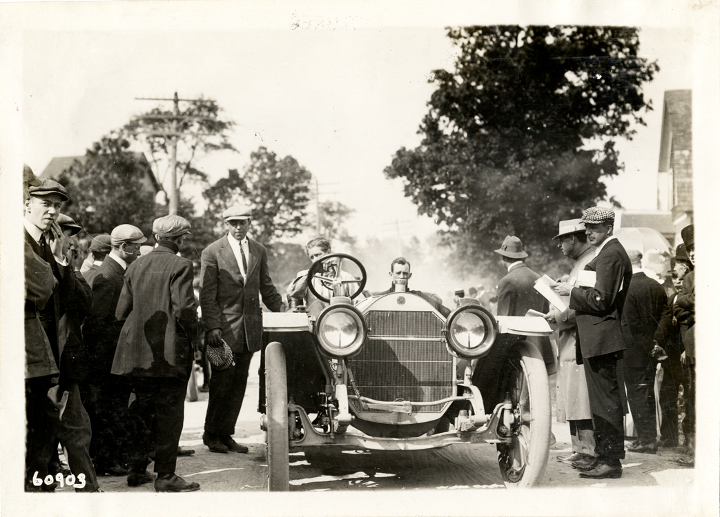 View of driver and passenger posing in a 1910 Amplex car, surrounded by onlookers. Stamped on back: "Spooner & Wells, Inc., photographers, telephones 3472-3473 Columbus, 1931 Broadway, New York." Handwritten on back: "Amplex, 1910."