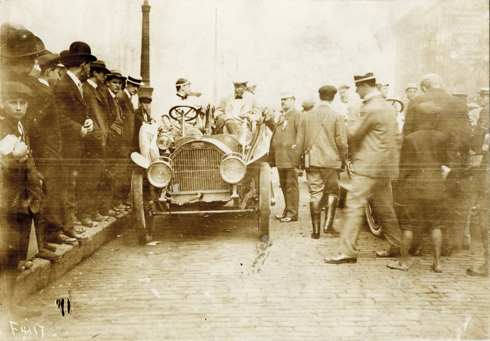 View of motorists in an Apperson car, surrounded by onlookers. Stamped on back: "Photo by N. Lazarnick, 29 West 42nd Street, New York." Handwritten on back: "Apperson, ca. 1907."