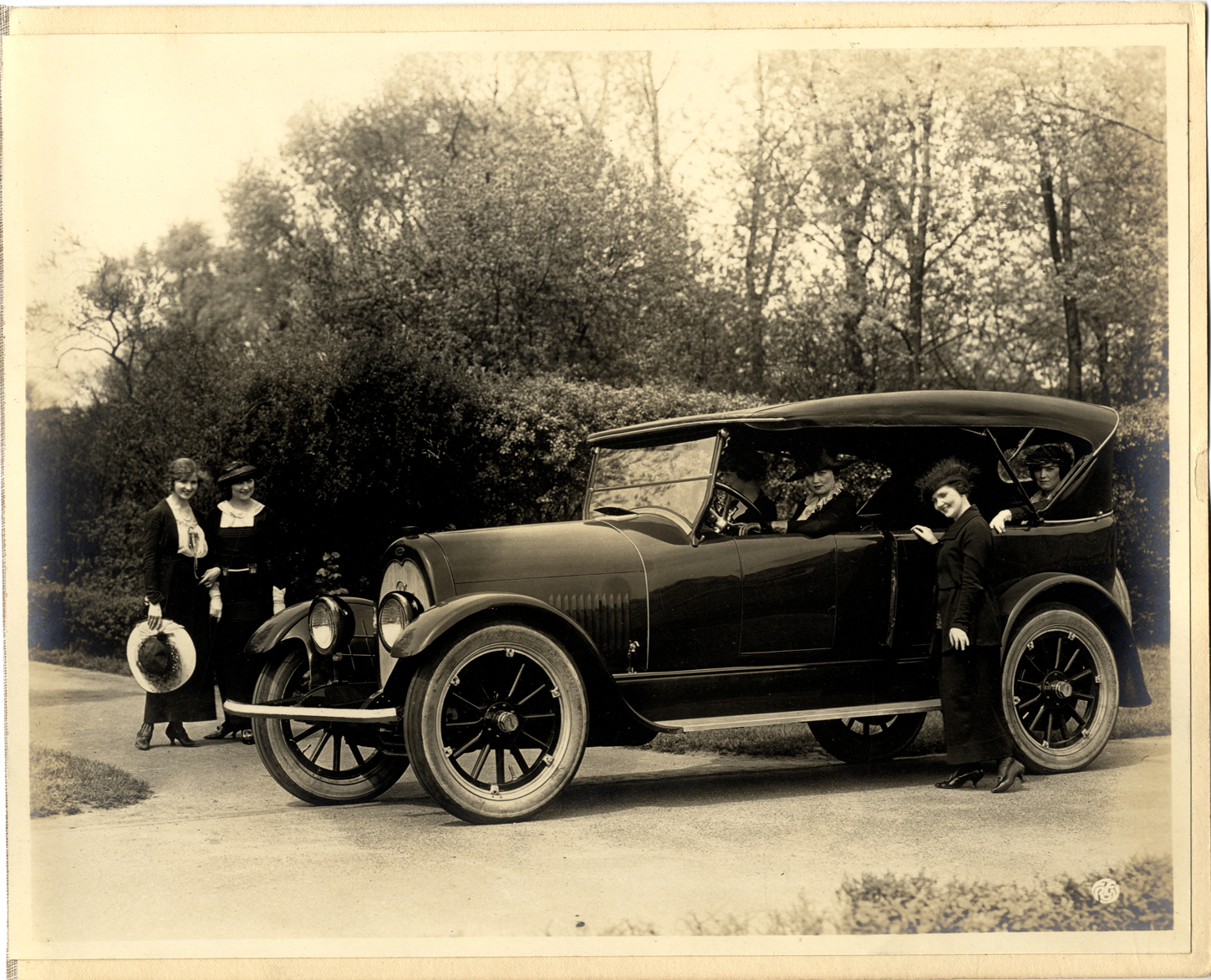View of several women posing with an Apperson Eight car. Handwritten on back: "Apperson Eight, c.1921-22."
