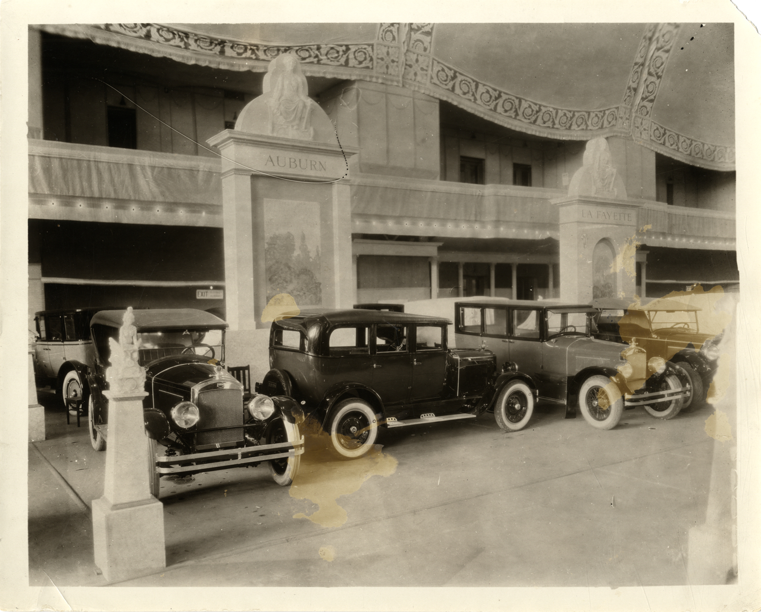 View of Auburn cars on display in trade show. "Auburn" sign is displayed on wall in background. Handwritten on back: "Auburn, 1924-25. L. to R. 1. 1924-25 Auburn 6-43 touring or possibly 6-63 touring. 2. 1924-25 Auburn 6-43 English coach. 3. 1924-25 Auburn 6-63 sedan."