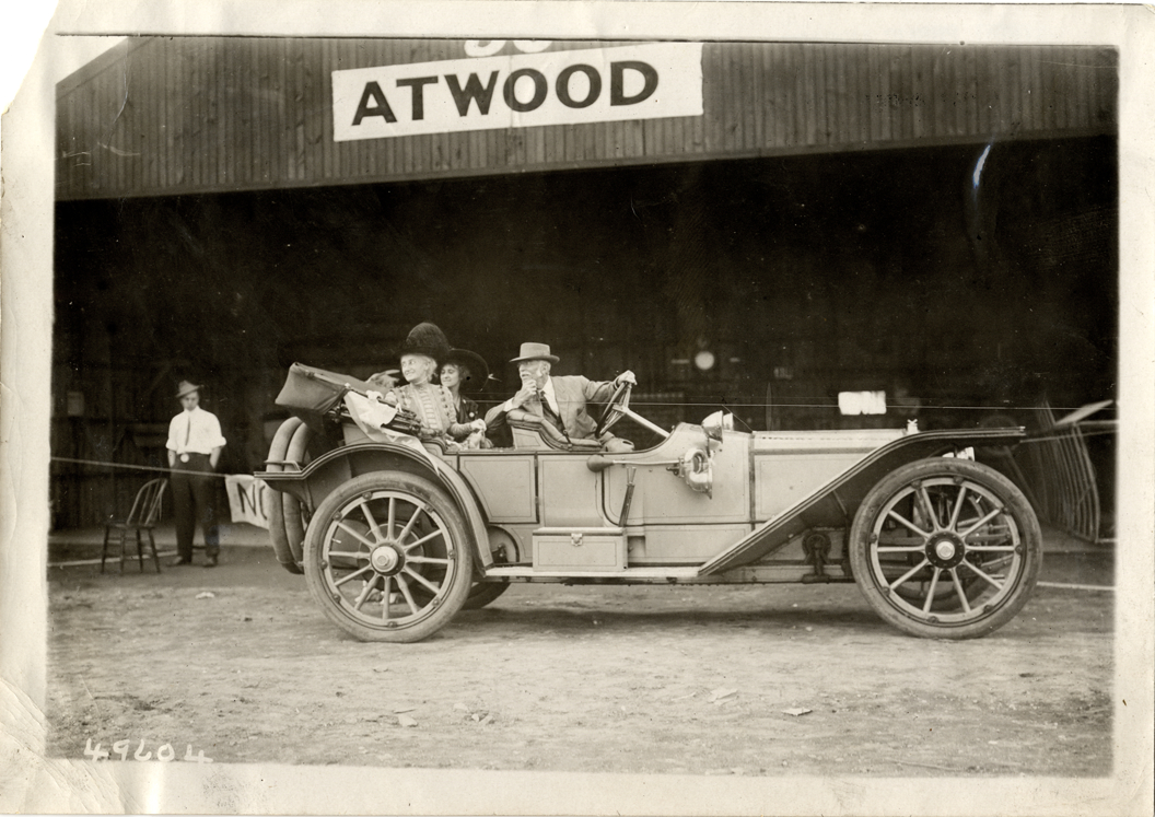 View of motorists in an American Underslung car. "Atwood" sign on building in background. Stamped on back: "Spooner & Wells, Inc., photographers, telephones 3472-3473 Columbus, 1931 Broadway, New York." Handwritten on back: "American, ca. 1912."