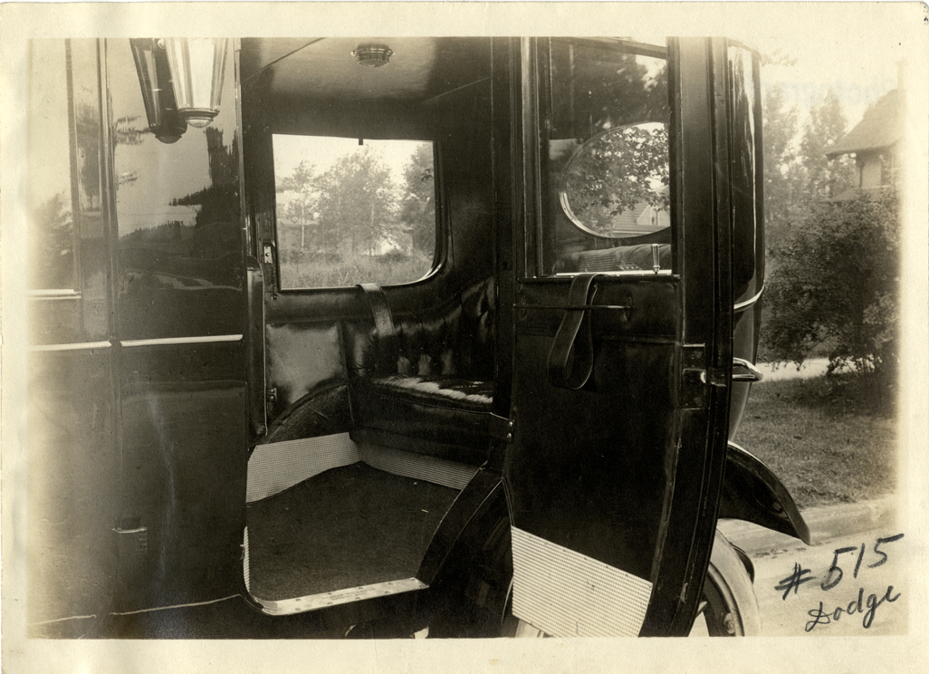 View of the interior of a car with body designed by the Erdman-Guider Company. Seats are visible through open car door.