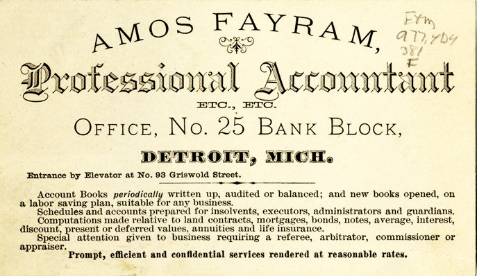 View of a business card for Amos Fayram. Printed on front [in part]: "Amos Fayram, professional accountant, etc., etc. Office, no. 25, Bank Block, Detroit, Mich. Entrance by elevator at No. 93 Griswold Street. Prompt, efficient and confidential services rendered at reasonable rates."