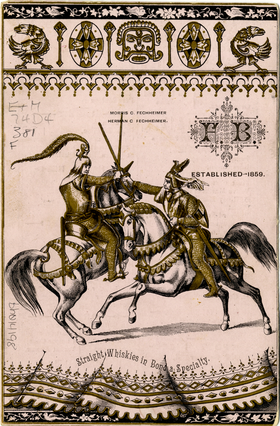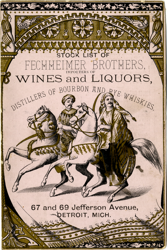 View of the stock list for Fechheimer Brothers wine and liquors. Two men on horseback are depicted on front and back covers. Printed on front: "Stock list of Fechheimer Brothers, importers of wines and liquors, distillers of bourbon and rye whiskies. 67 and 69 Jefferson Avenue, Detroit, Mich." Printed on back: "Morris C. Fechheimer, Herman C. Fechheimer. Established 1859. Straight whiskies in bond a specialty."