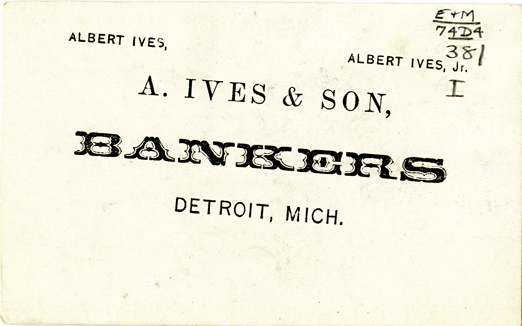 View of a business card for A. Ives & Son. Printed on front: "A. Ives & Son, bankers. Detroit, Mich. Albert Ives, Albert Ives, Jr."