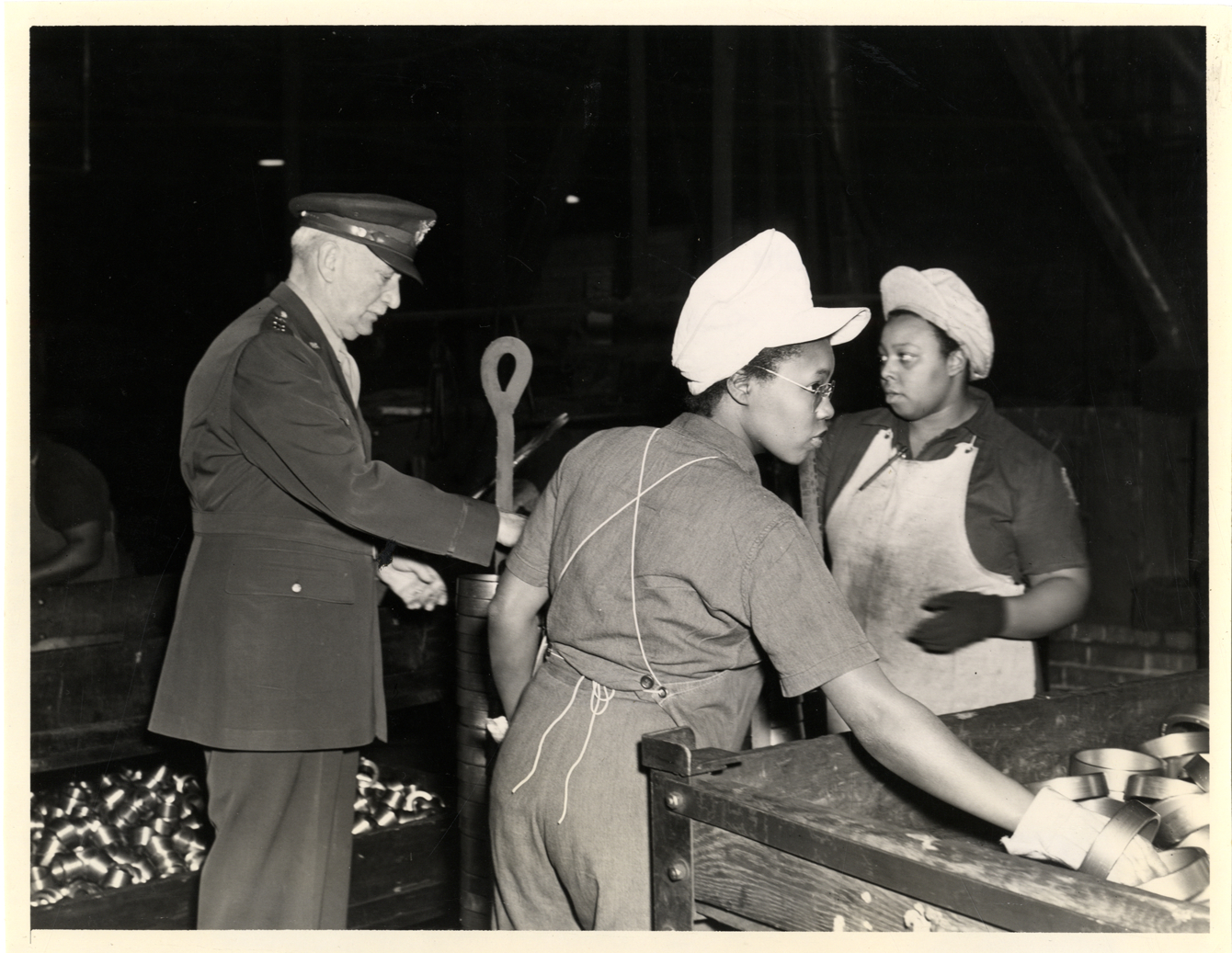 View of General William S. Knudsen with women workers at Timken Roller Bearing Company in Canton, Ohio. Handwritten on back: "Timken Roller Bearing, 25 Jan. 1944. Lt. General William S. Knudsen."