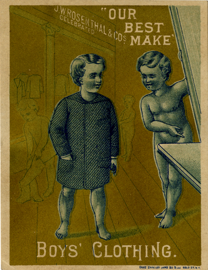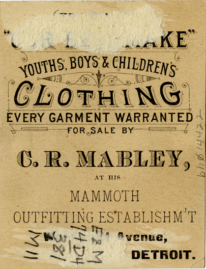 View of an advertising card for C.R. Mabley, depicting two boys at a tailor. Printed on front: "J.W. Rosenthal & Cos celebrated 'Our best make' boys clothing. Chas. Shields' Sons, 20 & 22 Gold St., N.Y." Printed on back: "Trade mark. 'Our best make' youths, boys & children's clothing. Every garment warranted for sale by C.R. Mabley at his mammoth outfitting establishm't. Woodward Avenue, Detroit."