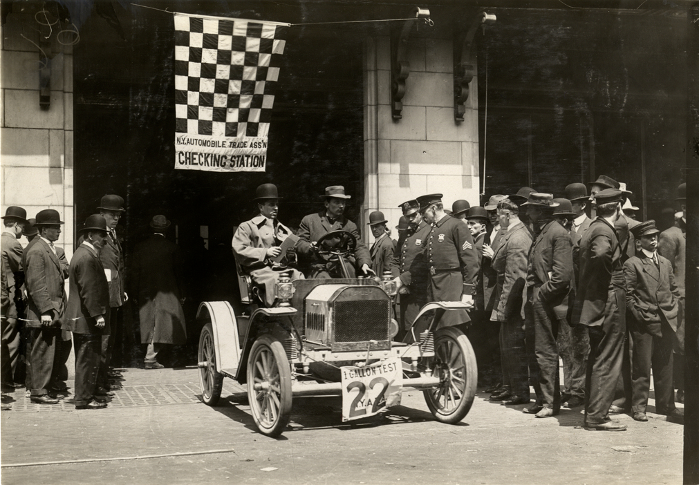 View of motorists in Brush car no. 22 at checking station, surrounded by spectators and policemen, during the 1909 New York Economy Contest. "N.Y. Automobile Trade Ass'n checking station" flag in background. The one-gallon efficiency contest was sponsored by the New York Automobile Trade Association as part of its second annual automobile carnival. Handwritten on back: "Brush, 1909."