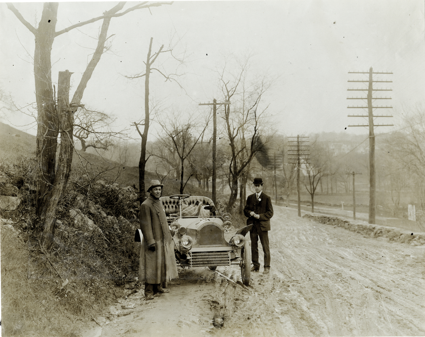 View of H.J. Koehler and unidentified man posing with a Buick Model C car on a rural dirt road. Stamped on back: "Photo by F. Ed. Spooner, 1536 B'way, telephone 6536-38th St., New York, N.Y." Handwritten on back: "HJ Koehler & Buick. Buick ca. 1905, Model C."