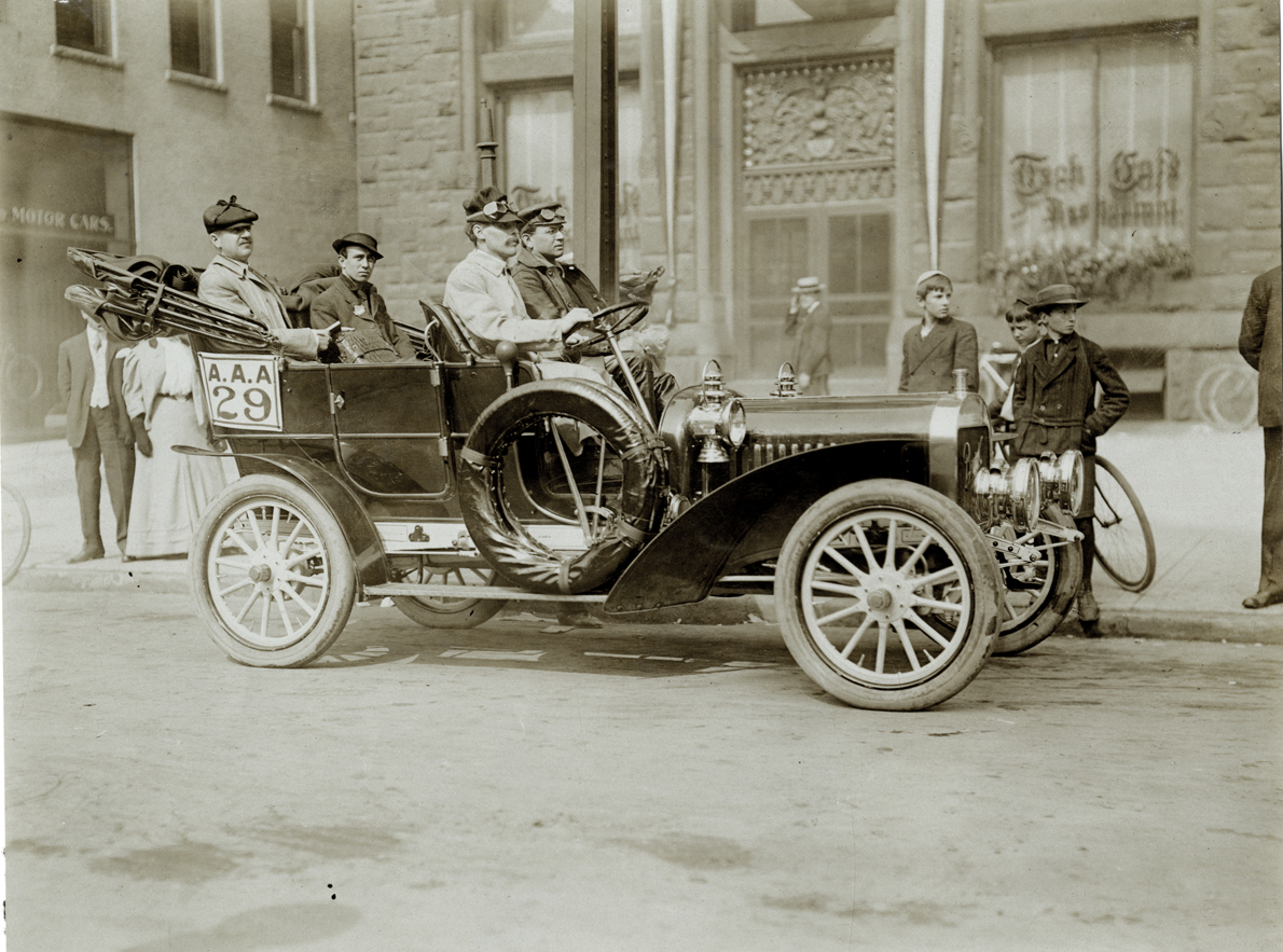 View of motorists in Buick car no. 29 during the 1906 Glidden Tour. "A.A.A. 29" sign is displayed on car; onlookers in background. Handwritten on back: "Buick, 1906. Glidden Tour."