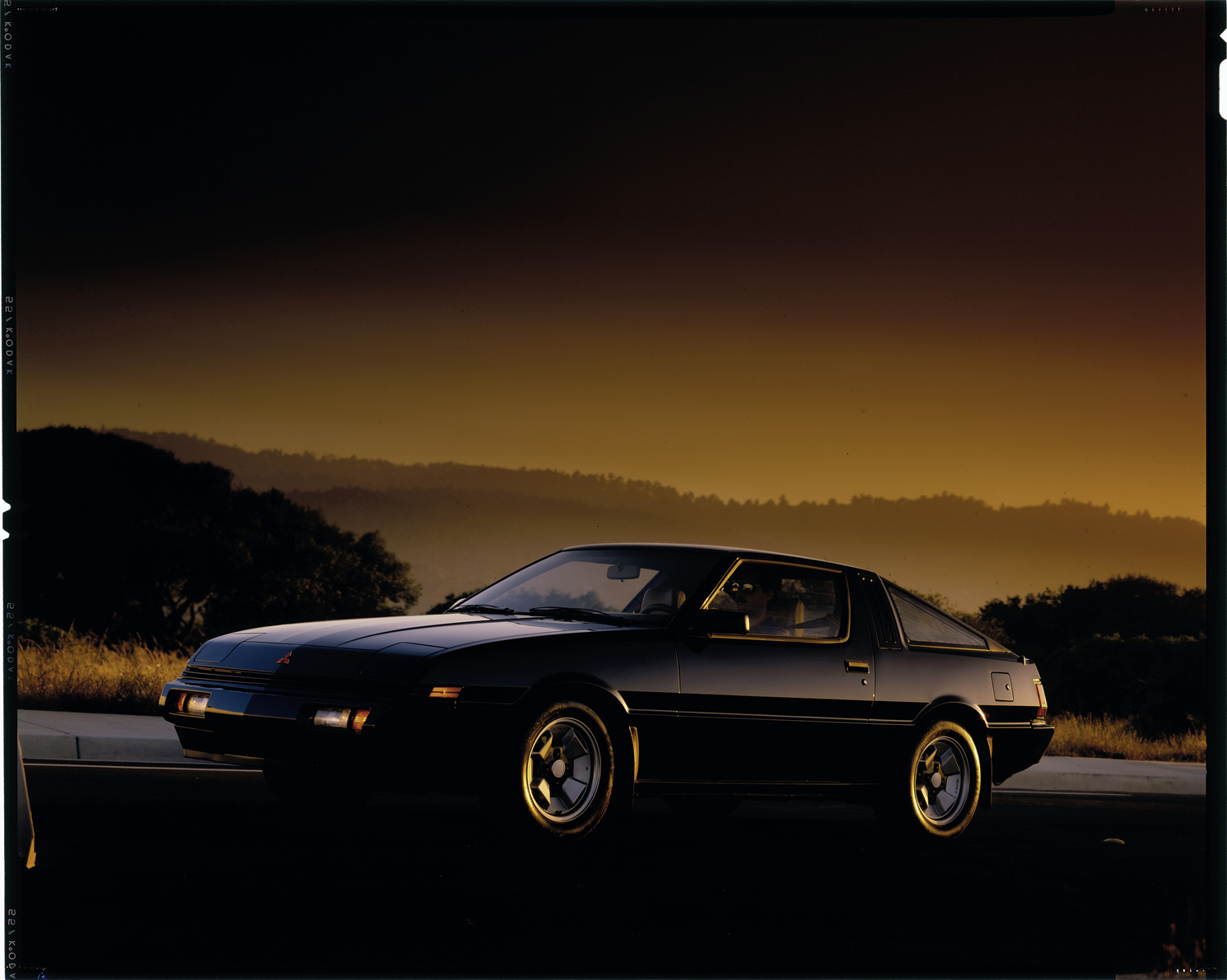 View of a man driving a Mitsubishi Starion coupe. Label on sleeve: "Mitsubishi, Starion, 1982-89."