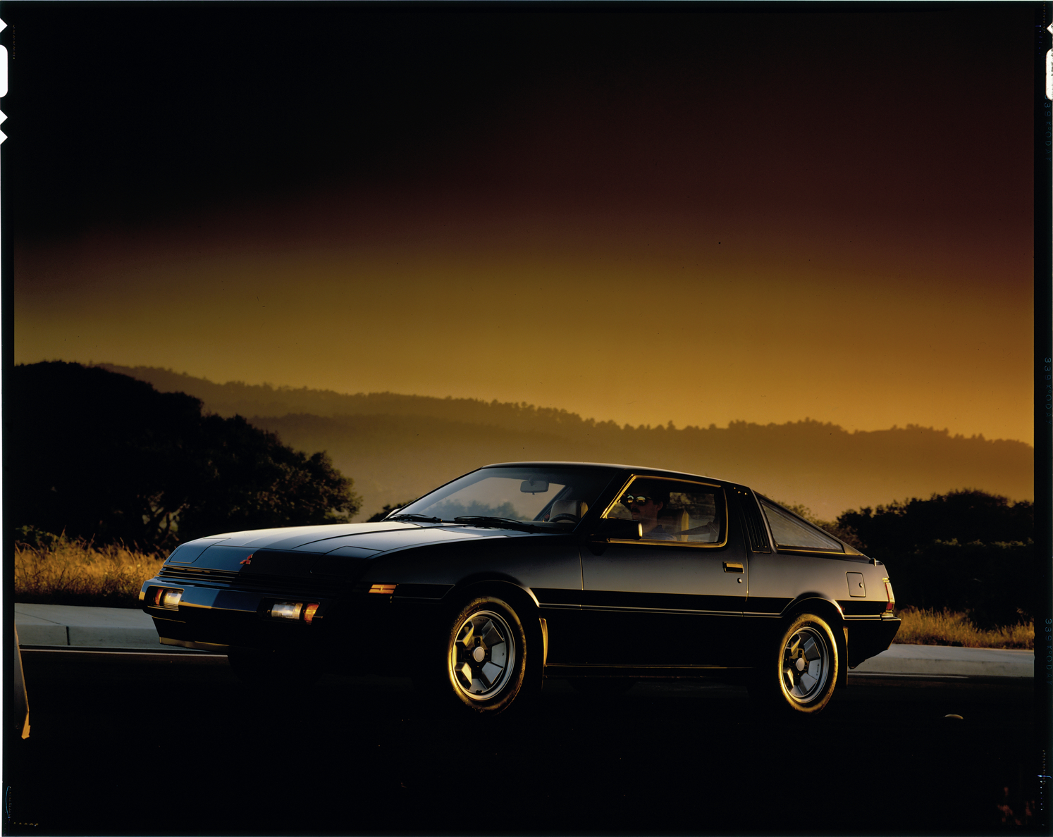 View of a man driving a Mitsubishi Starion coupe. Label on sleeve: "Mitsubishi, Starion, 1982-89."