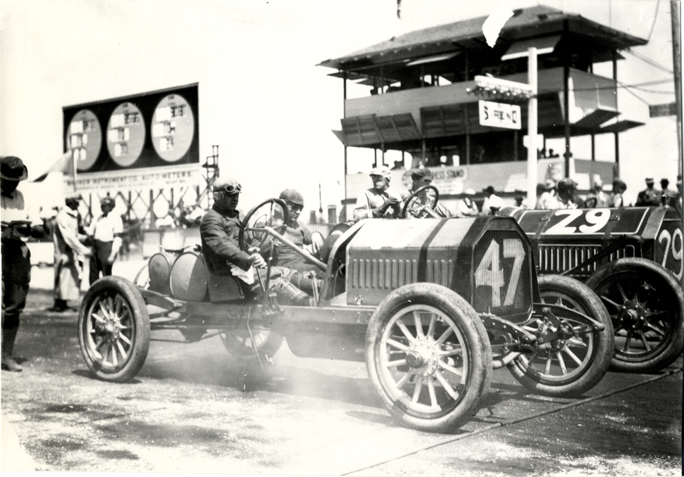 View of James B. Ryall in 1909 Buick Model D car no. 47 and Arthur Greiner in Thomas car no. 29 during the 1909 races at the Indianapolis Speedway in Indiana. Handwritten on back: "47, Ryall, Buick. 29, Greiner, Thomas. Ind. 1909. Buick, 1909. Model D."