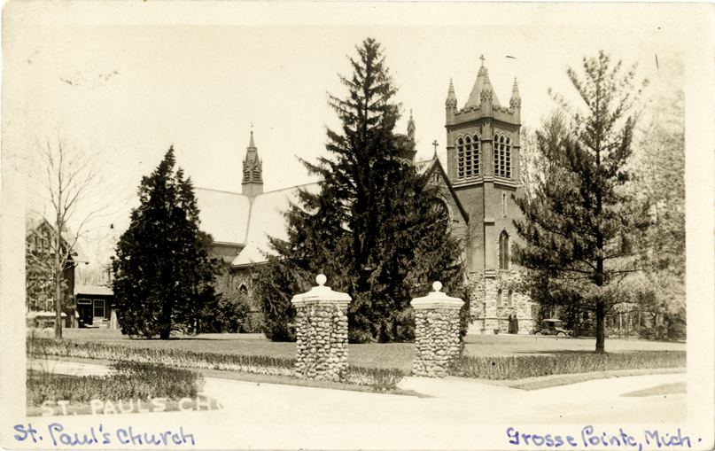 View of St. Paul's Catholic Church in Grosse Pointe, Michigan. Printed on front: "St. Paul's Church." Handwritten on front: "St. Paul's Church, Grosse Pointe, Mich." Handwritten on back: "St. Paul's Roman Catholic Church, Grosse Pointe."