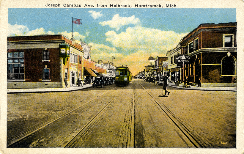 View of commercial buildings on Joseph Campau in Hamtramck, Michigan. Streetcar in background. Printed on front: "Joseph Campau Ave. from Holbrook, Hamtramck, Mich."