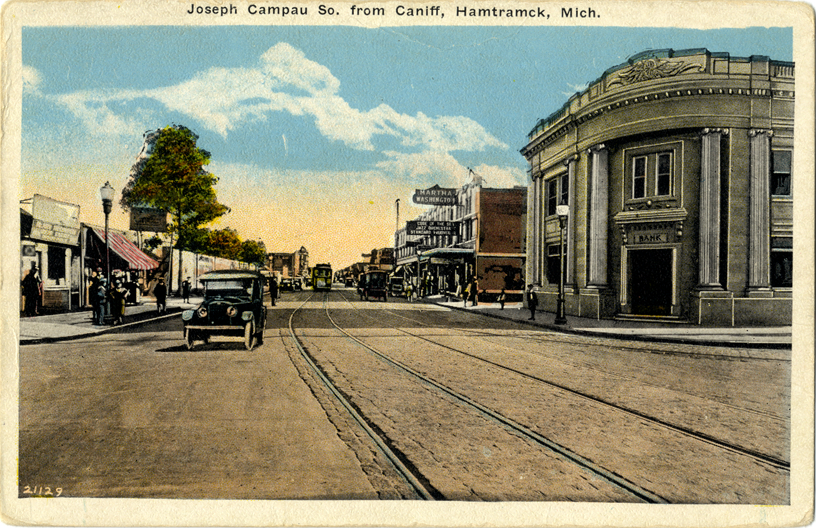 View of commercial buildings on Joseph Campau in Hamtramck, Michigan. Cars and streetcar in background. Printed on front: "Joseph Campau so. from Caniff, Hamtramck, Mich."