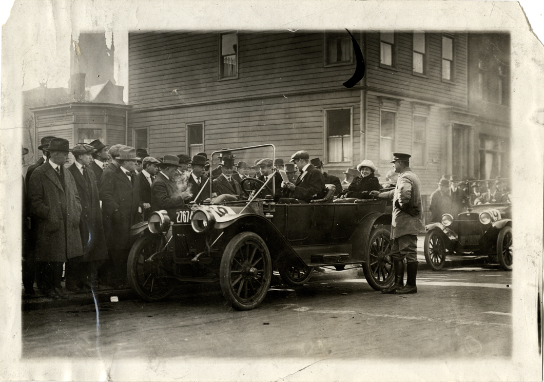 View of motorists in a 1912 Buick Model 34 car. Onlookers on sidewalk; commercial buildings in background. Handwritten on back: "Buick, 1912. Model 35."