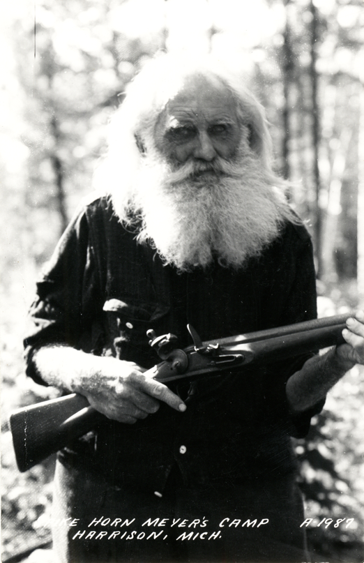 View of John "Spikehorn" Meyers holding a rifle at Harrison, Michigan. Printed on front: "Spike Horn Meyer's Camp, Harrison, Mich."