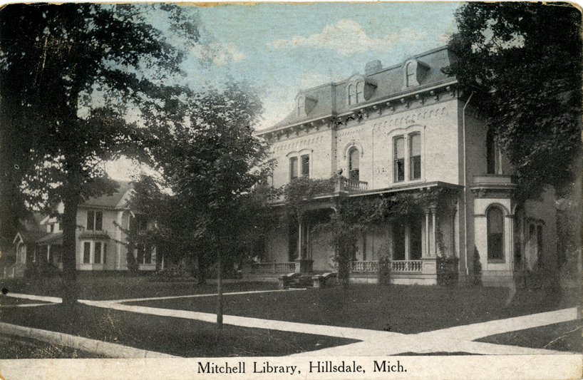View of the Mitchell Public Library in Hillsdale, Michigan. Printed on front: "Mitchell Library, Hillsdale, Mich." Printed on back: "Pub. by C.L. Thatcher & Son." Handwritten on back: "Dear Aunt, We arrived here all safe last night we are at Will's. Cathern & George came down and went to fair today George is feeble [undecipherable]. Edith." Card is postmarked September 23, 1922.