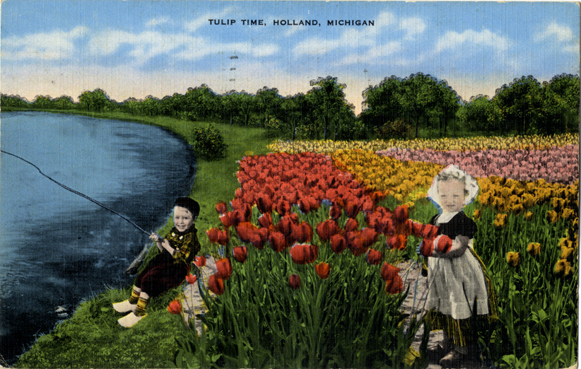 View of a boy and girl, wearing Dutch costume, in a tulip field at Holland, Michigan. The boy, holding a fishing pole, sits on the edge of a lake. Printed on front: "Tulip time, Holland, Michigan." Printed on back: "The striking effect of massed tulips stirs the soul of all who view them whether they acknowledge themselves as flower lovers or not. Without fragrance, but with clean cut contour and positive, vivid color the tulip may well be called the masculine flower. Over 500 varieties of tulips are grown on the bulb farms at Holland, Michigan. Pub. by Du Saar Photo Service. Natural color postcard made in U.S.A. by E.C. Kropp Co., Milwaukee, Wis. (ELL)." Handwritten on back: "Dear Mrs. Ellis, Have been here in Mich. with my niece, had a wonderful trip up here, [undecipherable] on the way. This tulip time in Holland minus the celebration. I'll be thinking of all of you. Sincerely, Mrs. [undecipherable]." Card is postmarked May 22, 1945.