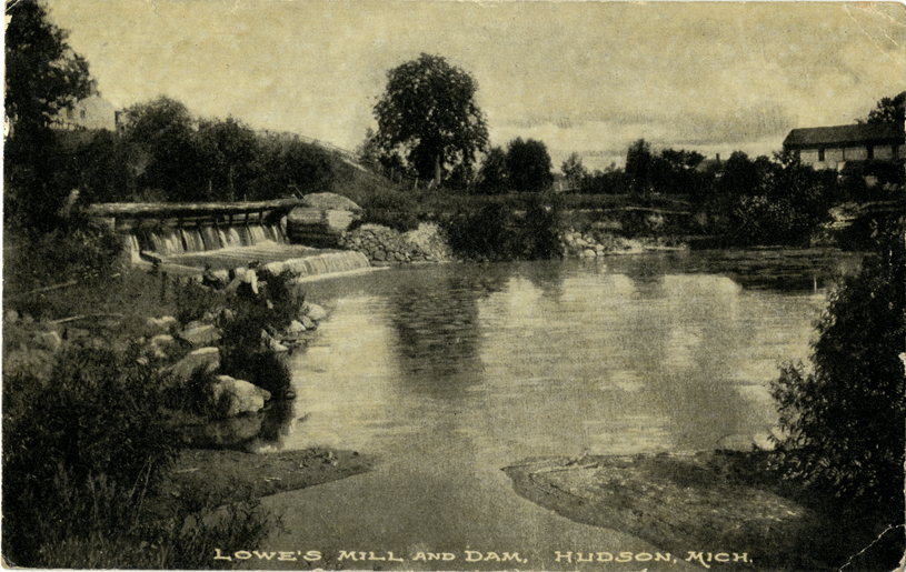 View of Lowe's Mill and dam in Hudson, Michigan. Printed on front: "Lowe's Mill and dam, Hudson, Mich." Handwritten on back: "7/15/11. Dear Put, How is fatty-tight-pants? Are you and Nibbs doing anything now? I wish I could be with you, for I am lonesome for the fellows and tired of being with the ladies all the time. Mark." Card is postmarked July 17, 1911.