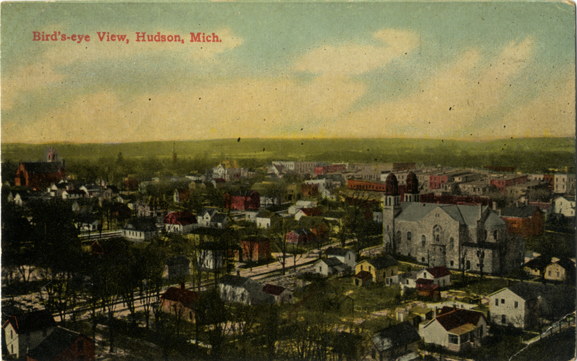 Bird's-eye view of Hudson, Michigan. Printed on front: "Bird's-eye view, Hudson, Mich." Handwritten on back: "Hudson, Mich. Nov. 15, '13. Dear Cousin, Twenty years ago tonight you went home. Remember? Kind regards, your cousin, [undecipherable]." Card is postmarked November 17, 1913.