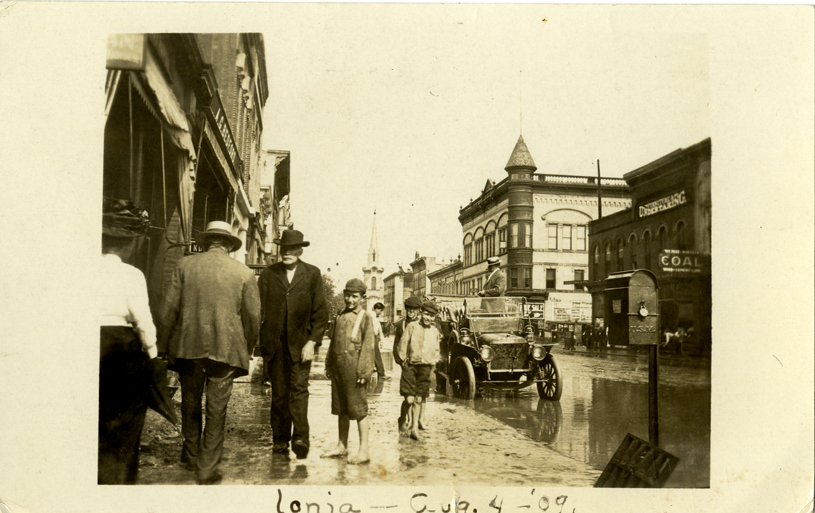 View of a man and several barefoot children walking on an unidentified street in Ionia, Michigan after a rainstorm. Street is flooded; mailbox in foreground. Car and commercial buildings in background. Handwritten on front: "Ionia, Aug. 4, '09." Handwritten on back: "Aug. 7, '09. Dear Annie, And what is the matter with Canada? and Annie and all the rest. Don't hear a single word from you there any more. Hope you are all as well as we. Darwin Post has the misfortune to break his collarbone this summer in a [undecipherable]. Grandma is feeling quite well again. We had a big rain here last Wed. and a cloudburst in Ionia. Kept things pretty lively I guess. Please write Annie and tell us all the news, etc. Lina." Card is postmarked August 7, 1909.