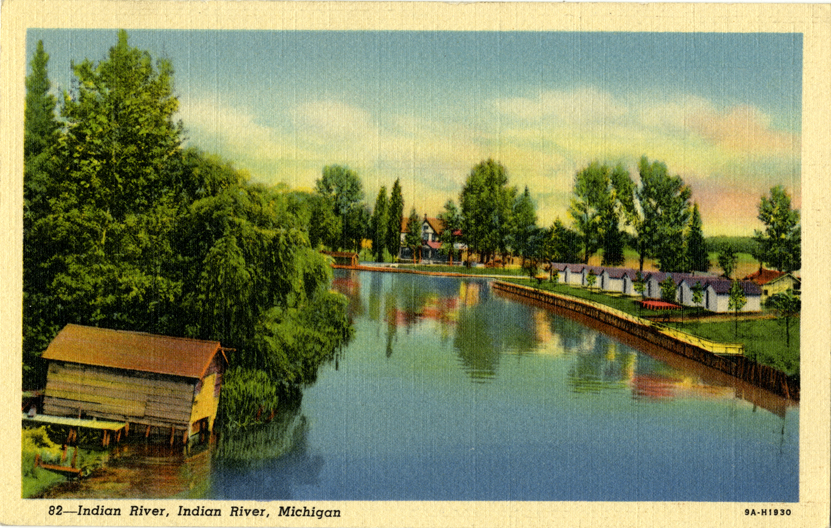 View of the Indian River in Indian River, Michigan. Printed on front: "82. Indian River, Indian River, Mich." Printed on back: "Mrs. A.G. Cook, Petoskey, Mich. Genuine Curteich-Chicago 'C.T. Art-Colortone' post card (reg. U.S. Pat. Off.)"