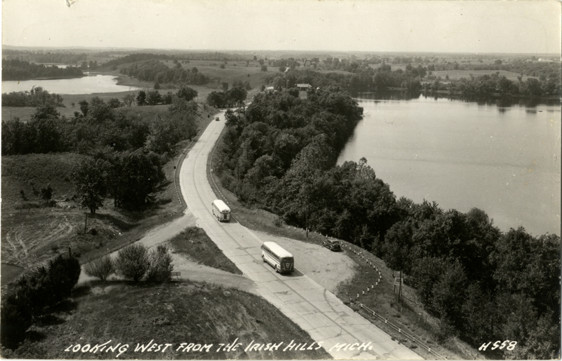 Bird's-eye view of buses on road in the Irish Hills district of Michigan. Lakes in background. Printed on front: "Looking west from the Irish Hills, Mich."
