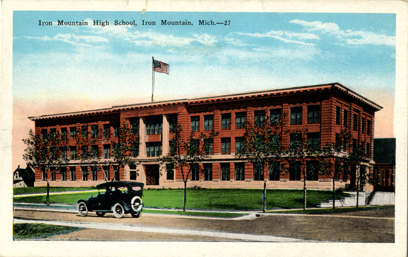 View of a car parked in front of Iron Mountain High School in Iron Mountain, Michigan. Printed on front: "Iron Mountain High School, Iron Mountain, Mich." Printed on back: "E.C. Kropp Co., Milwaukee."