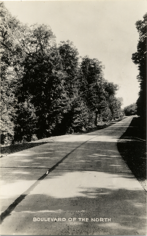 View of an unidentified road in Iron Mountain, Michigan. Printed on front: "Boulevard of the north." Printed on back: "This is a genuine photograph." Handwritten on back: "Iron Mountain, Mich."