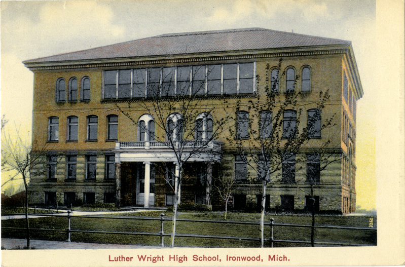 View of the Luther Wright High School in Ironwood, Michigan. Printed on front: "Luther Wright High School, Ironwood, Mich." Printed on back: "Made in Germany. R.A. Schroeder, importer & publisher, Ironwood, Mich."