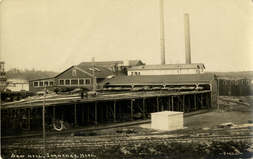 View of sawmill in Jennings, Michigan. Printed on front: "Saw mill, Jennings, Mich. Beebe."