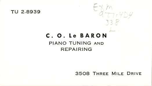 View of a business card for C.O. LeBaron. Printed on front: "C.O. LeBaron. Piano tuning and repairing. 3508 Three Mile Drive. TU 2-8939."