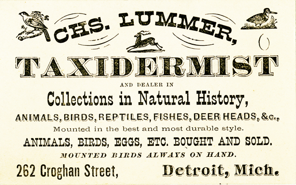 View of a business card for Charles Lummer. Printed on front: "Chs. Lummer, taxidermist and dealer in collections in natural history, animals, birds, reptiles, fishes, deer heads, & c., mounted in the best and most durable style. Animals, birds, eggs, etc., bought and sold. Mounted birds always on hand. 262 Croghan Street, Detroit, Mich."