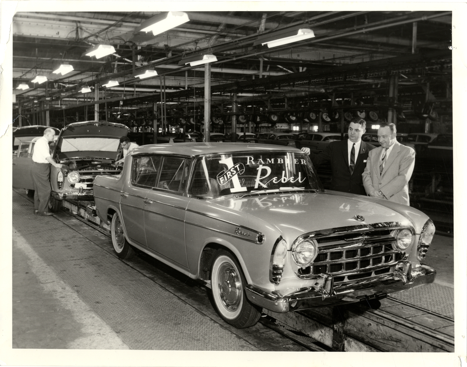 View of J.W. Mueller and D.R. Hutchinson posing with the first Rambler Rebel sedan on the assembly line at the Kenosha, Wisconsin factory. Two workers with car in background. Label on back: "Rambler Rebels roll. The first Rambler Rebel, American Motors Corporations's new high-performance car, is shown coming off the final assembly line in Kenosha, Wis. Looking over the new model are J.W. Mueller (left), works manager, and D.R. Hutchinson, general chassis superintendent. The Rebel, which has a 327 cubic inch V-8 engine, went into production March 4, 11 days ahead of schedule because of high dealer and customer interest. The car which is equipped with a four-barrel carburetor, develops 255 horsepower. Production of the Rambler Rebel with electronic fuel injection, which will boast 288 horsepower, will begin later. In engineering tests the 255-horsepower model equipped with overdrive accelerated from 0 to 60 in less than eight seconds."