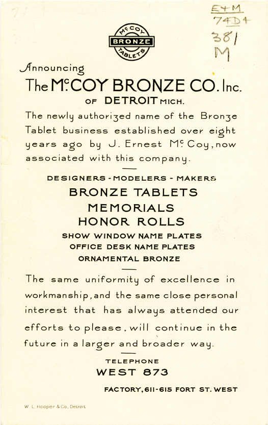 View of a business announcement for McCoy Bronze Co. Printed on back: "Announcing the McCoy Bronze Co. Inc. of Detroit, Mich. The newly authorized name of the bronze tablet business established over eight years ago by J. Ernest McCoy, now associated with this company. Designers, modelers, makers. Bronze tablets, memorials, honor rolls, show window name plates, ornamental bronze. The same uniformity of excellence in workmanship, and the same close personal interest that has always attended our efforts to please, will continue in the future in a larger and broader way. Telephone West 873. Factory, 611-615 Fort St. West. W.L. Hooper & Co., Detroit."