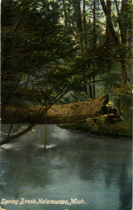 View of a man fishing in a stream at Kalamazoo, Michigan. Printed on front: "Spring brook, Kalamazoo, Mich." Printed on back: "Made in Germany." Handwritten on back: "Hello Red, Haven't seen you in so long thought I would write. Give my love to Smith the old fool. Justin." Card is postmarked August 26, 1912.