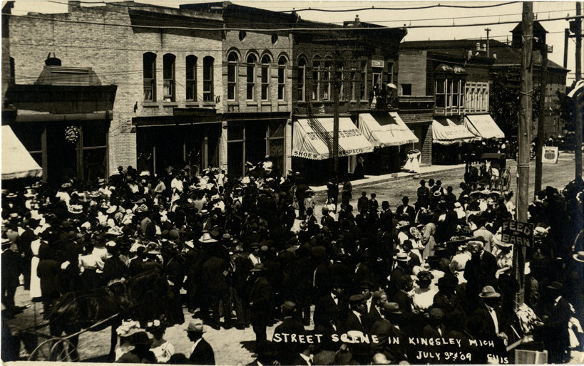 View of crowd on unidentified street in Kingsley, Michigan. Commercial buildings in background. Printed on front: "Street scene in Kingsley, Mich. July 3rd '09." Handwritten on back: "Kingsley, Aug. 18. Dear Mother, Don't think I am lost I would of been home before this but have been waiting for Cora and then I don't know if she is going or not she is to call up sometime today. I don't care much anyway. Got a postal from L.C. said for us to come and visit them and they would try and make the best things under circumstances. I think I'll go wouldn't you. P.M. If Cora don't call up before 5 this evening I will be home tonight." Card is postmarked 1909.