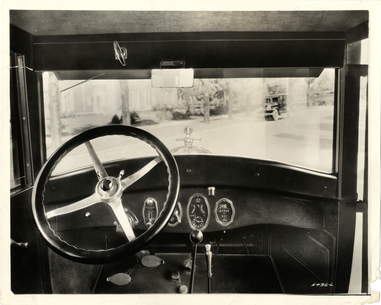 View of the interior of a Buick Model 41 car, showing windshield, steering wheel and instrument panel. Handwritten on back: "Buick, ca. 1924. Model 41. Fisher windshield."