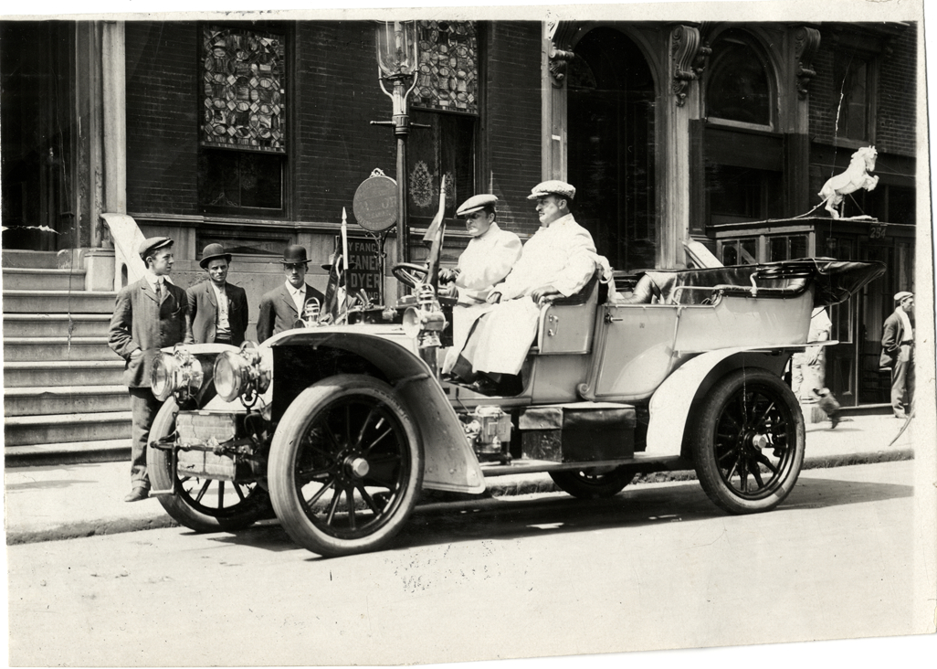 View of motorists in a C.G.V. car. Onlookers stand on sidewalk in background. Handwritten on back: "C.G.V., ca. 1910."