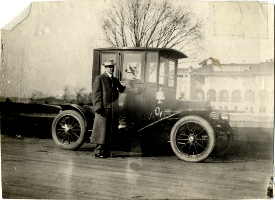 View of a man posing with a 1910 Cadillac car. Typed on back: "Cadillac." Handwritten on back: "Special sample closed body I bought from Henry Leland & put on a four cylinder Cadillac, one of the first closed bodies in Detroit."