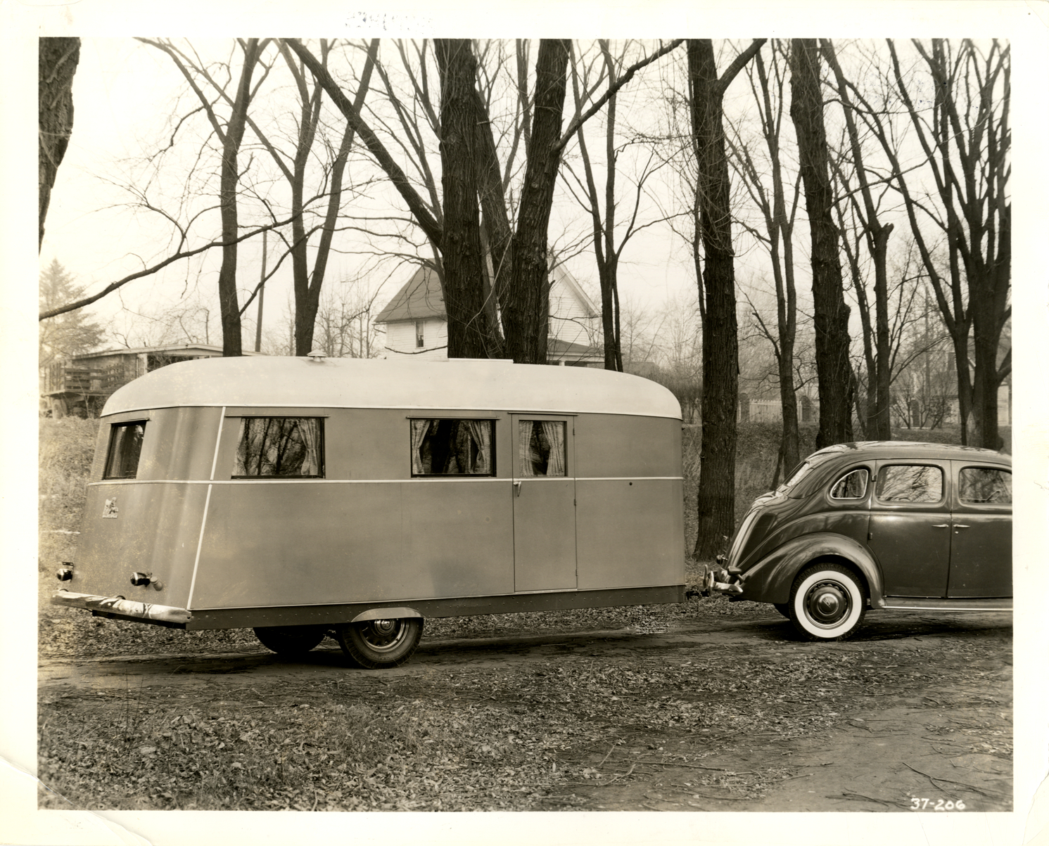 View of a car pulling a Covered Wagon camping trailer. Handwritten on back: "1937 Deluxe model, [undecipherable] a '38 Covered Wagon. Camping, 1937."