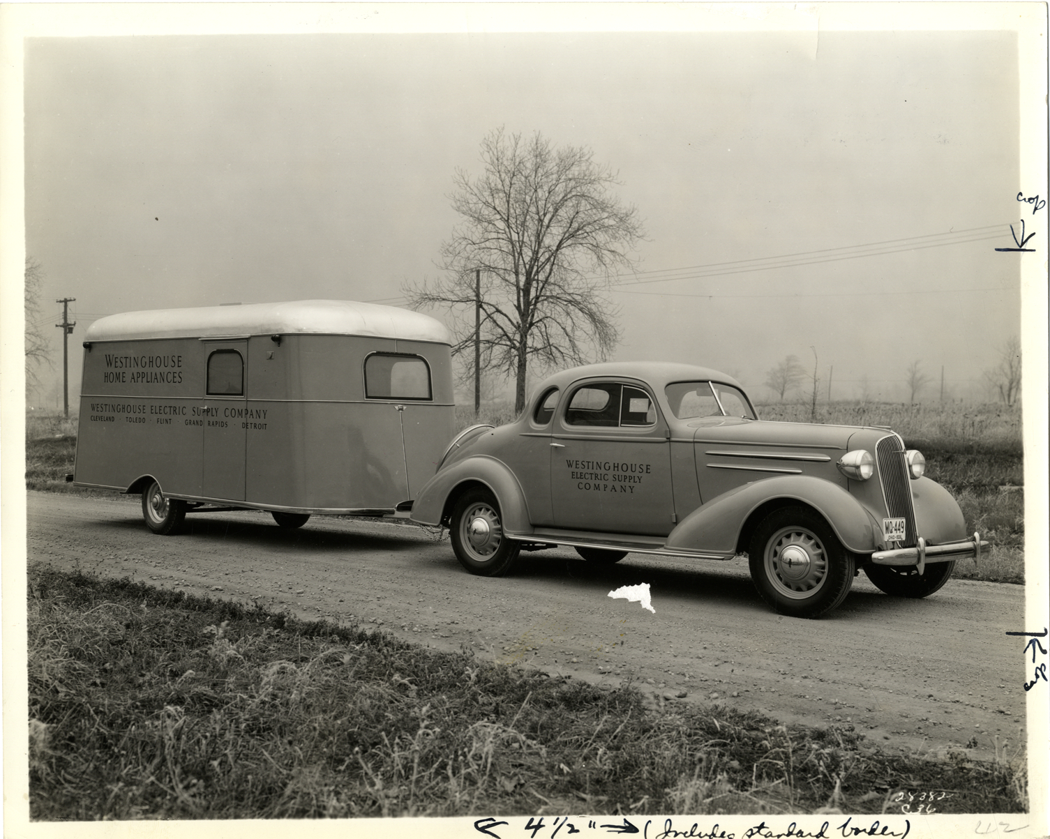 Automobile pulling a Westinghouse Home Appliances mobile display unit Palace Coach trailer